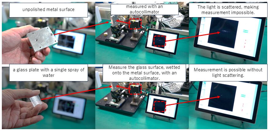 On unpolished metal surfaces, laser light is usually scattered, making accurate measurement with a laser autocollimator difficult. However, by applying a thin, lightweight glass plate, such as a cover glass, onto the metal surface with one side coated with water or oil—a technique known as “wetting”—an optically flat measurement surface can be formed, allowing measurement with a laser autocollimator.